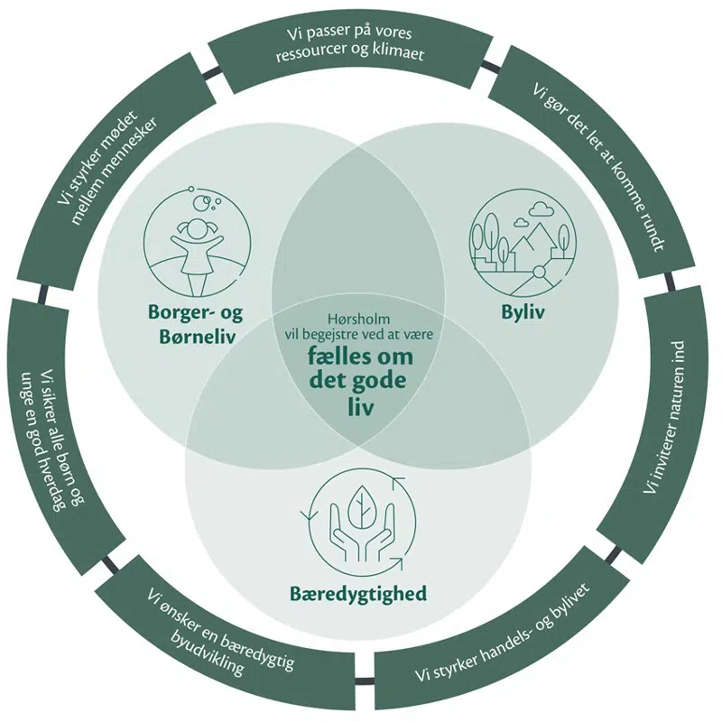 Hørsholmstrategien tager udgangspunkt i de tre pejlemærker Borger- og børneliv, Byliv og Bæredygtighed med dertilhørende 7 indsatsområder: